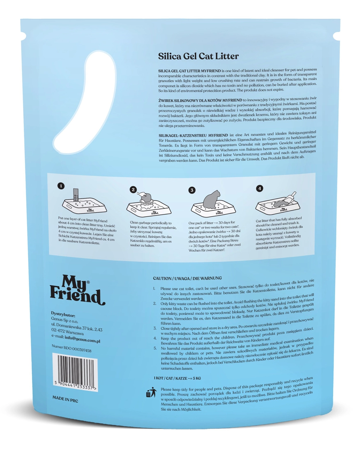 My Friend oferuje naturalny żwirek silikonowy, który jest hipoalergiczny i w pełni bezpieczny dla zdrowia. Dzięki antybakteryjnym właściwościom, Twój kot będzie korzystać z kuwety w higienicznym środowisku, a Ty nie musisz się martwić o nieprzyjemne zapachy. Wybierz produkt, który troszczy się o zdrowie i komfort Twojego pupila!